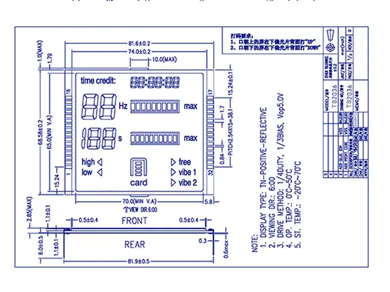 TN semi-transparent, monochrome LCD screen customization, can be customized bright orange, orange and other monochrome color, TS2036 is TN type LCD, operating temperature -0 to +50 degrees Celsius, storage temperature -20 to +70 degrees Celsius, metal pins, white light, used in healthcare LCDs
